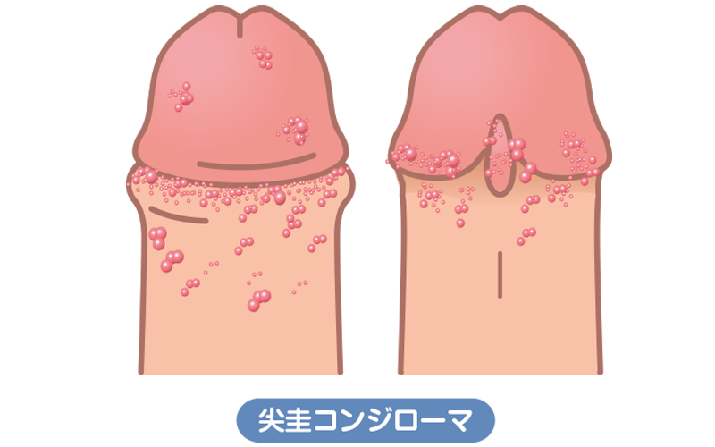 尖圭(せんけい)コンジローマは、ヒトパピローマウイルスが原因で起こるウイルス性の感染症です。尖圭コンジローマは、性器や肛門周辺にイボができる性感染症です。粘膜と粘膜の接触により感染するので挿入してなくても素股などのオーラルセックスでも感染してしまいます。初期症状は小さく尖ったイボですが、放置すると大きくなり数も増え、イボ同士が融合してカリフラワー状になることがあります。ヒトパピローマウイルスは感染力が強く、尖圭コンジローマの感染者と性行為をした場合、60~80%の確率でパートナーも感染すると言われています。また再発率も高いため、包茎の方は包皮に潜伏しているウィルスを包茎治療にて同時にコンジローム治療をお勧めいたします。